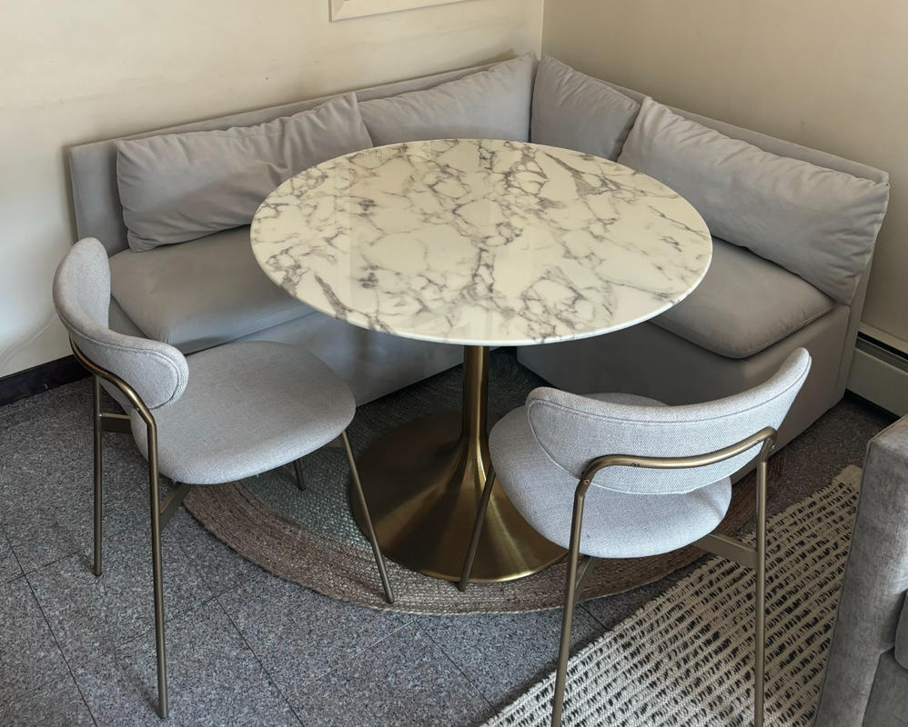 Construction: Modholic Artificial Marble Top Tables are exclusively made of genuine stone. Grey veining is impregnated into the stone to mimic Italian marble. Additional care is taken to make the veining look natural. The solid stone slabs are 1.5" inch thick and heavy, giving balance to the unique table base.